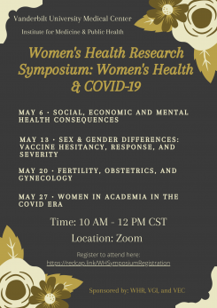 The Women’s Health Research center in the Institute for Medicine and Public Health (IMPH) is hosting the 2022 Women’s Health Research symposium. This year’s theme is Women’s Health and COVID- 19; subtopics are located on the flier. Please join us in attending the Women’s Health Research Symposium via Zoom every Friday in May (6, 13, 20, 27) at 10 AM CST – 12PM CST.